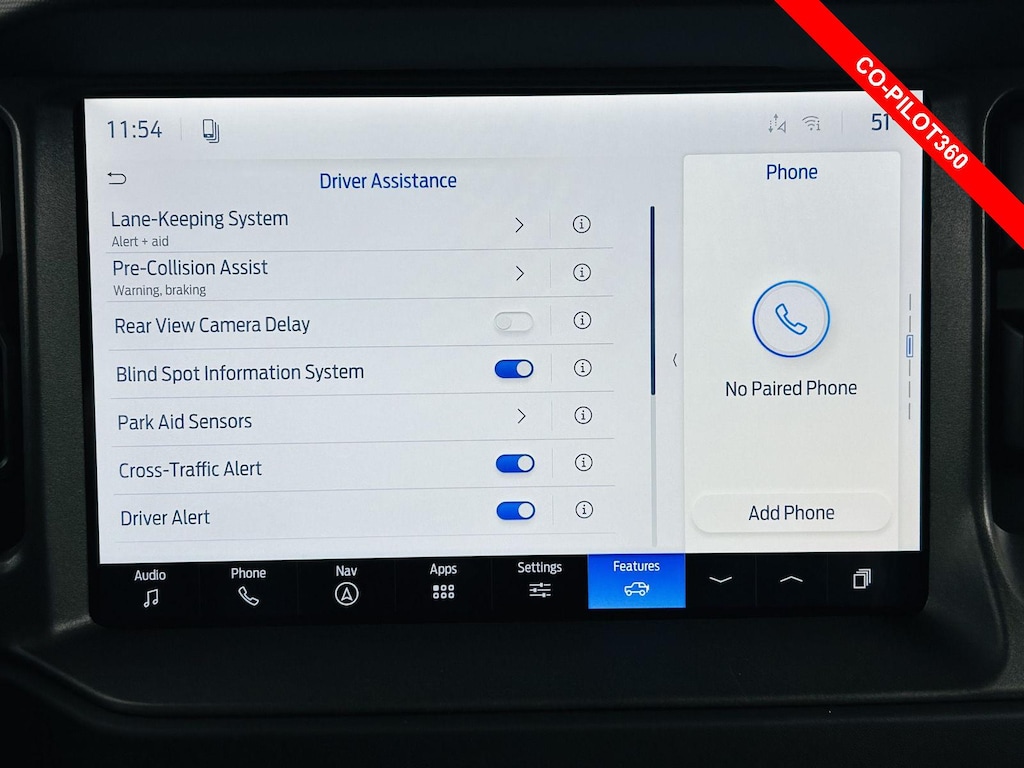 - Includes vehicle with standard equipment, 2-door Intelligent Access, ambient footwell lighting, Connected Navigation with one year subscription included, pinch-to-zoom capability, live traffic, predictive destinations and route guidance, one box search, dual smart charging USB ports, dual-zone electronic automatic temperature control, front row heated seats, driver and front passenger illuminated sliding visor vanity mirrors, 400W Pro Power Onboard (back side of center floor console), reverse sensing system, remote start system (with automatic transmission), Ford Co-Pilot360, automatic high beam, blind spot information system with cross-traffic alert, lane-keeping alert, lane-keeping aid, driver alert, pre-collision assist with automatic emergency braking, pedestrian detection, forward collision warning, dynamic brake support, and rear view camera with backup assist grid lines.